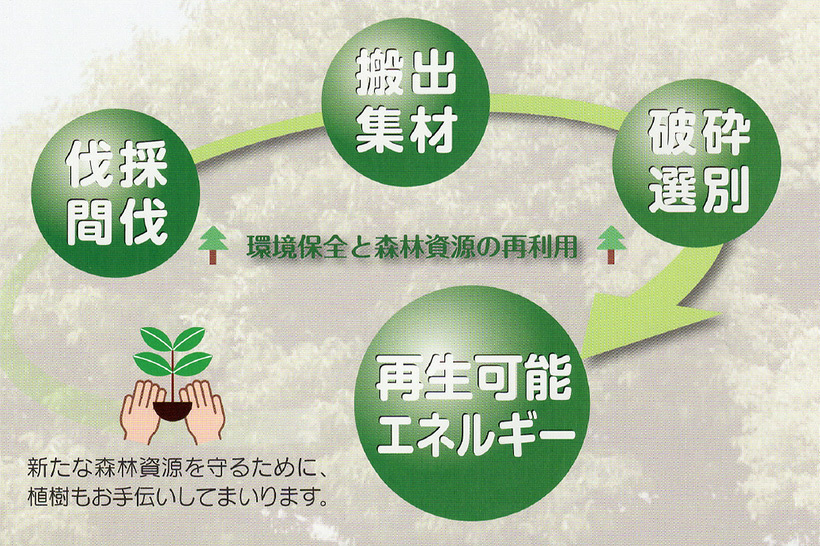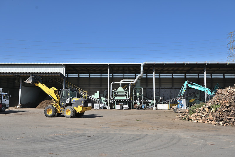 そしてもう一つ、木質産業廃棄物及び木質一般廃棄物の収集・運搬・処分と、木材・木質産業廃棄物及び木質一般廃棄物のチップ加工と加工品の運搬・販売、林業、農業も手がけています。こちらは大津町に開設した森林事業部事務所と木質リサイクル工場で業務を行っております。