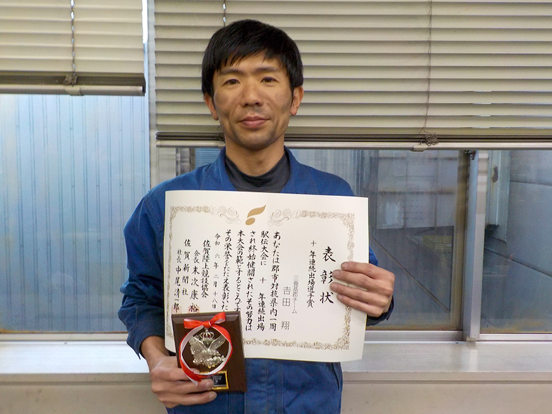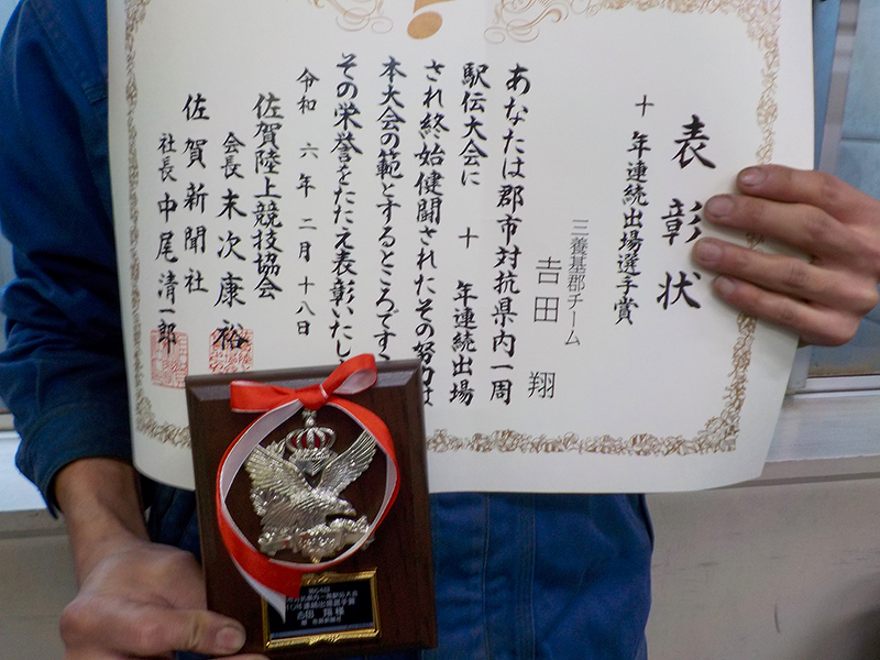 佐賀事業所に所属する吉田翔さんが佐賀県郡市対抗駅伝の10年連続出場選手として表彰を受けました。 令和6年2月18日 当社の佐賀事業所に所属する吉田翔さんが、 佐賀県郡市対抗駅伝の10年連続出場選手として表彰を受けました。 ※吉田翔さんの「吉」は「土」に「口」