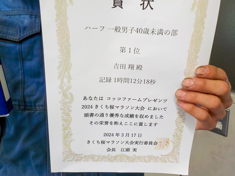 佐賀事業所に所属する吉田翔さんが2024きくち桜マラソン大会ハーフ一般男子40歳未満の部にて優勝! 令和6年3月17日(日)に開催された2024きくち桜マラソン大会において、 佐賀事業所に所属する吉田翔さん(39歳)が、 ハーフ一般男子40歳未満の部にて2位に3分程差をつけ、土砂降りの中 ぶっちぎりで優勝しました! 仕事も現場リーダーとして頑張っております。 今後がますます楽しみです! ※吉田翔さんの「吉」は「土」に「口」
