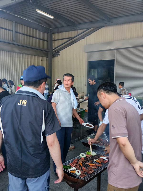 午前中のソフトボール大会に引き続き、本社駐車場にてBBQを、社員や社員の家族、96名の参加で始まりました。